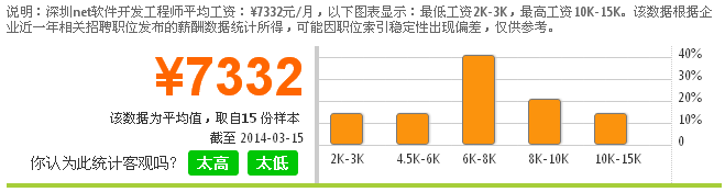 然后就是.net软件工程师的薪水情况,他们每月的平均工资为7332, 最低工资2K-3K,最高工资10K-15K,以下图片显示出了深圳.net的薪资情况的。